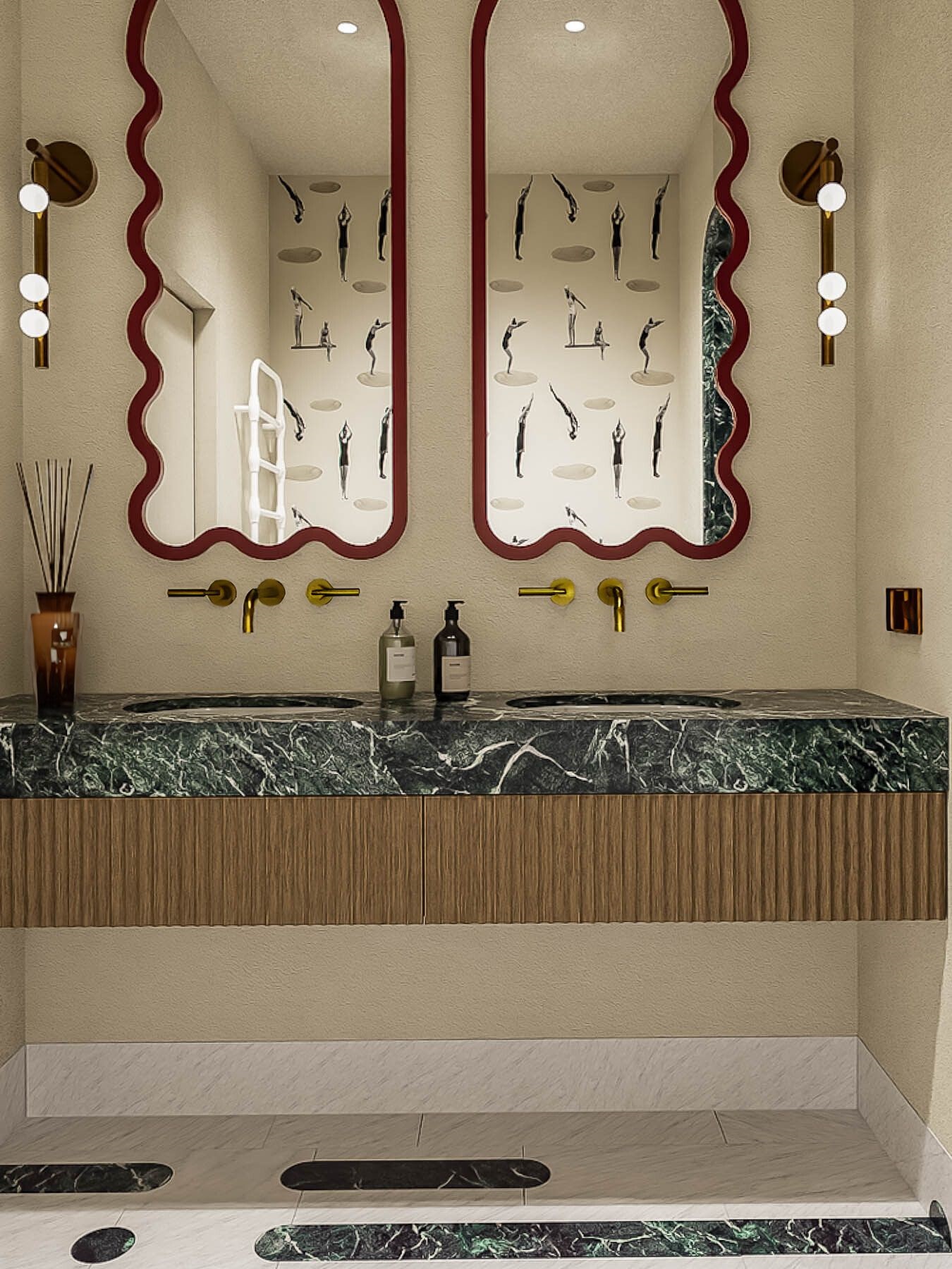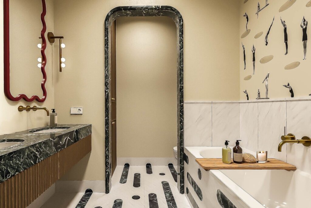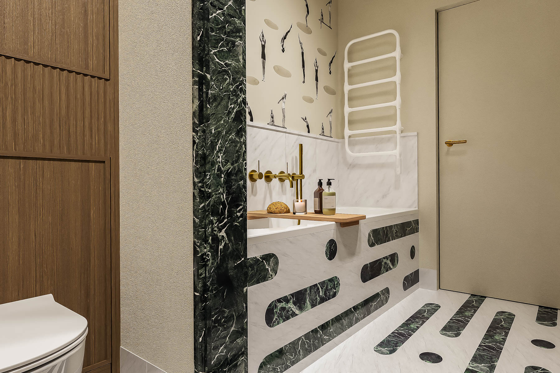 Naturalne forniry, kamień o wyrazistym rysunku oraz subtelne detale metaliczne budują warstwowość i szlachetność kompozycji. W łazience zastosowano marmur Carrara oraz Saint Denis, wykorzystany w sposób ciągły na posadzce i w zabudowie wanny, co pozwoliło uzyskać efekt monolitycznej bryły.