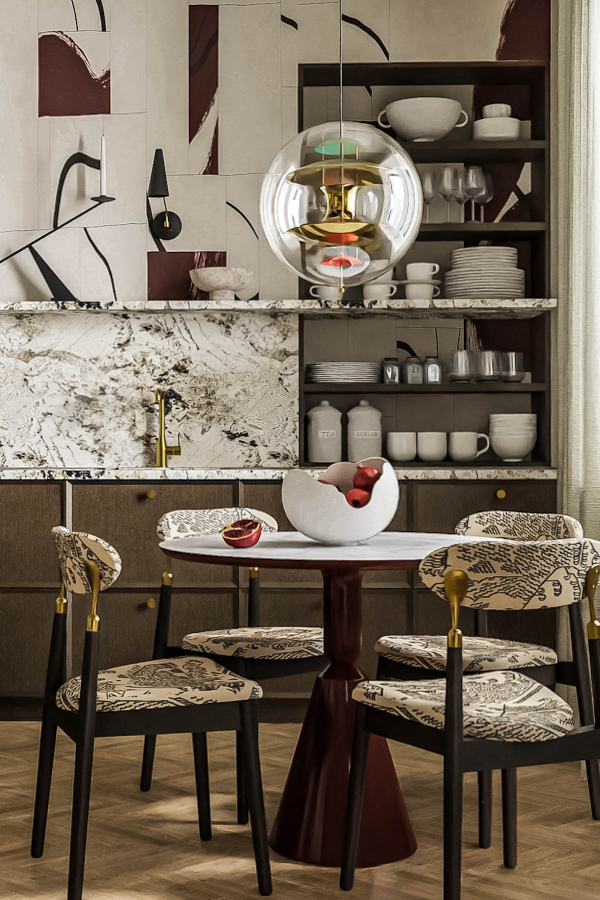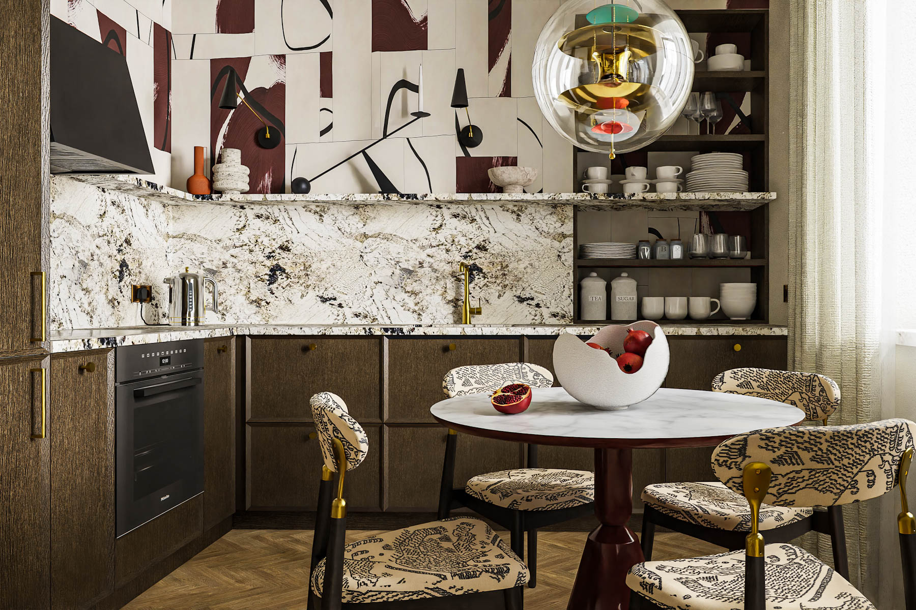 Kuchnia stanowi integralną, lecz wizualnie zdyscyplinowaną część strefy dziennej. Czysta geometria zabudowy kuchennej pozwala zachować reprezentacyjny charakter wnętrza przy utrzymaniu ergonomii pracy. Bogactwo wzorów i faktur zastosowanych w projekcie kuchni – od rysunku kamienia po wzory tapety i tkanin – budują warstwową, harmonijną kompozycję. Zróżnicowanie materiałów pozostaje jednak podporządkowane głównemu motywowi wnętrza i nie konkuruje z dominantą przestrzenną i kompozycyjną salonu – fornirowaną zabudową ściany.