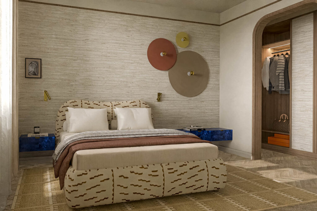 Autorskim akcentem są projektowane indywidualnie szafki nocne wykończone czeczotą w odcieniu kobaltu – świadomy kontrapunkt dla neutralnej bazy materiałowej.